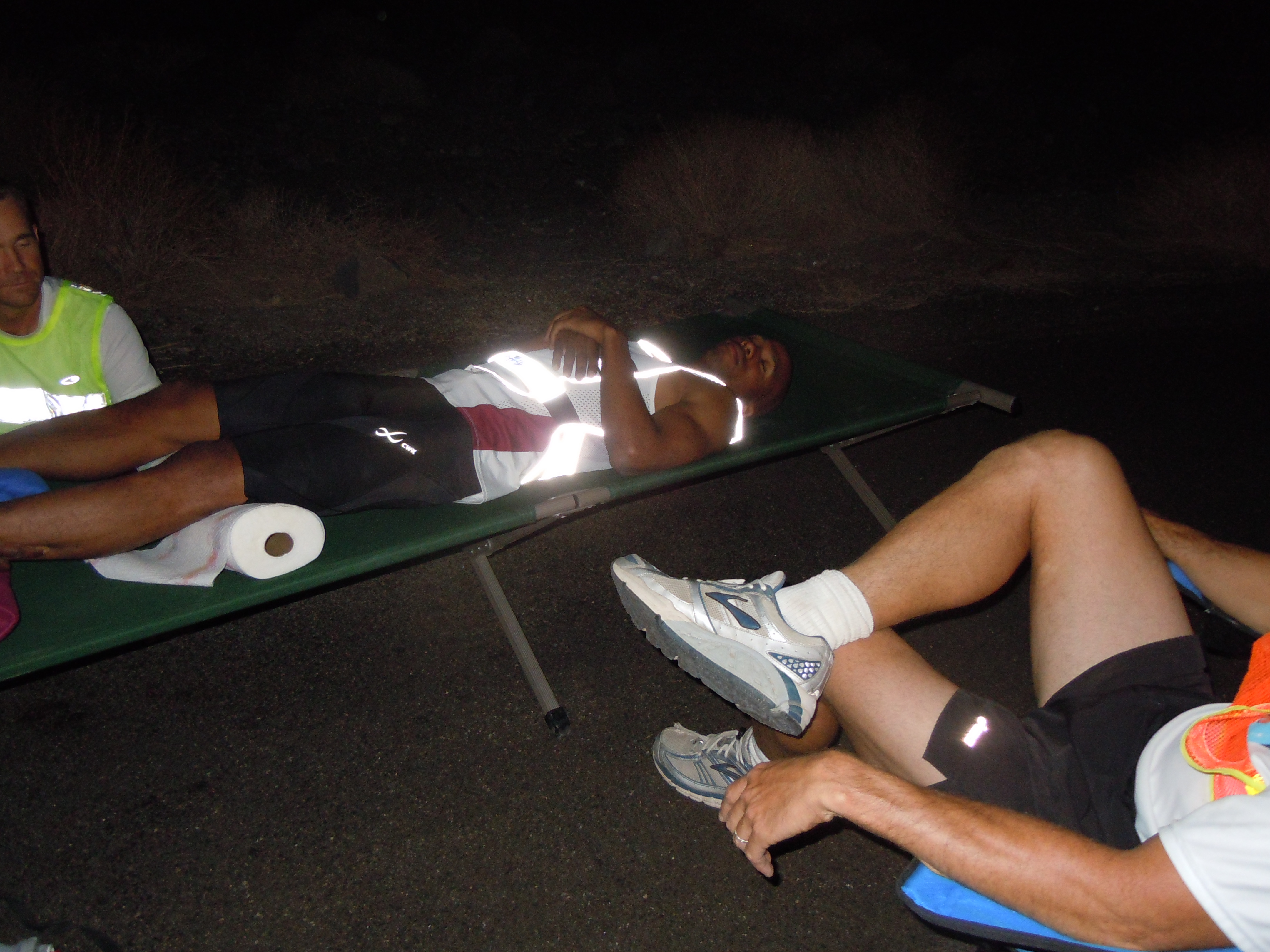 it. We’d discussed this many times over the phone prior to gameday. I was ardently against sleeping during a race. But in my discussions with her regarding previous BW crew experience, backed by experiences from other veterans, I began to see the validity. So both crew vehicles circled up the “wagons” at a turnout and broke out the “cot of doom.” It really was not that bad but I had hyped it up in my head so much prior to it happening that I could not fall asleep. The crew was moving like a well-oiled machine it seemed. There were hands everywhere: feeding food, giving fluids, and checking my feet. Tricia gave my legs a good rubdown that would have reduced me to baby talk in ordinary circumstances. However, at thirty-five minutes, we packed up and got ready to get back on the road.