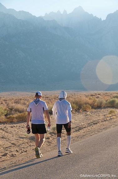 - (12) clip-on LED blinkers (8 were required), (1) Petzl MyoXP headlamp, (1) Mylar blanket (cut into the shape of my footsoles to minimize the amount of heat pushed into my feet from the road surface), Death Valley road maps, sponges, food cups/bowls/utensils, garden sprayers (keep the body moist), BodyGlide, emergency first-aid kits, Zombie Runner blister-kit (tincture, bandaids, and tape were the only things used), (8) Ultimate Direction water bottles/holders (designate ones for the crew), (8) Ultimate Direction gel flasks (held 5 servings), (4) sets of batteries (AA & AAA), plastic baggies (for organization & container), gloves (hygienic handling of food), electric thermometer, bandanas (regular & “Cool-Off” variety came in handy for cooling and nose-bleeds coming down Mt. Whitney), neck gaiter (protection against saind blown in face), glasses (wrap-around Oakleys for wind and sand protection), Wet Ones (for personal hygiene and gear clean-up), sunscreen (Scape/Alba Botanica/Coppertone/Banana Boat-the spray variant was more expedient and cleaner), eye drops (for the wind and dry conditions), chapstick (in a squeeze tube), pens/notepad (to record fluids & food consumption and poop rates), camera (to document the experience), aloe (for sunburns (it will happen), music (CDs/iPod…to keep the crew awake), (1) satellite phone, and a folding chair or a collapsible cot (for crew breaks and/or rest-stops)